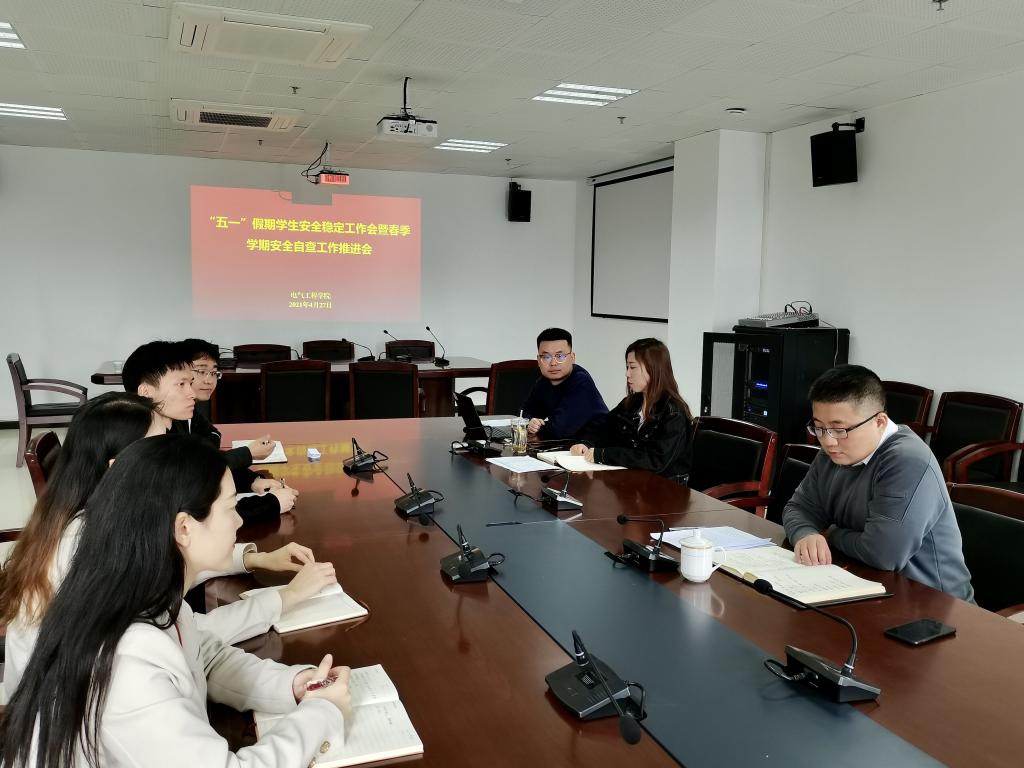 “五一”假期即将到来,为做好常态化疫情防控与学生稳定安全工作,传达落实上级关于安全稳定工作的精神要求,维护“五一”校园的平安稳定,4月27日上午,电气工程学院在曲江校区综合楼1211会议室召开“五一”假期学生安全稳定工作会暨春季学期安全自查工作推进会。会议由学院党委副书记王林主持,学工办全体辅导员参加。