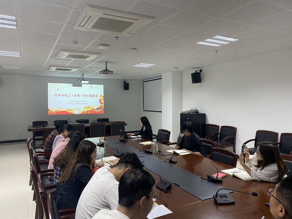 会上,支部党员赵婷以《百年未有之大变局下的中国承诺》为题,为支部全体党员上了一节生动的党课。