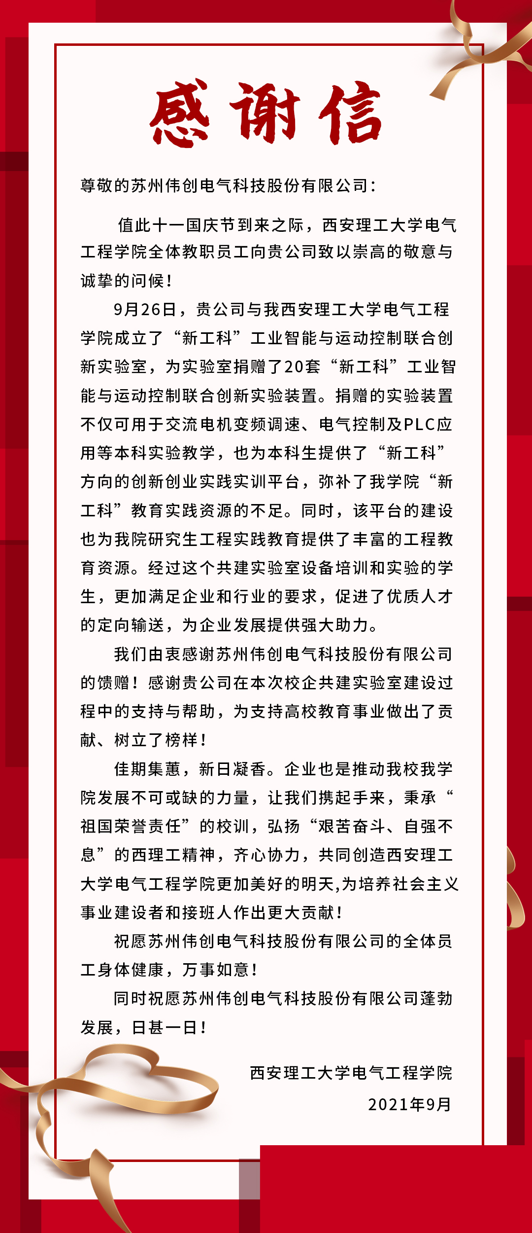 我院致苏州伟创电气科技股份有限公司的感谢信