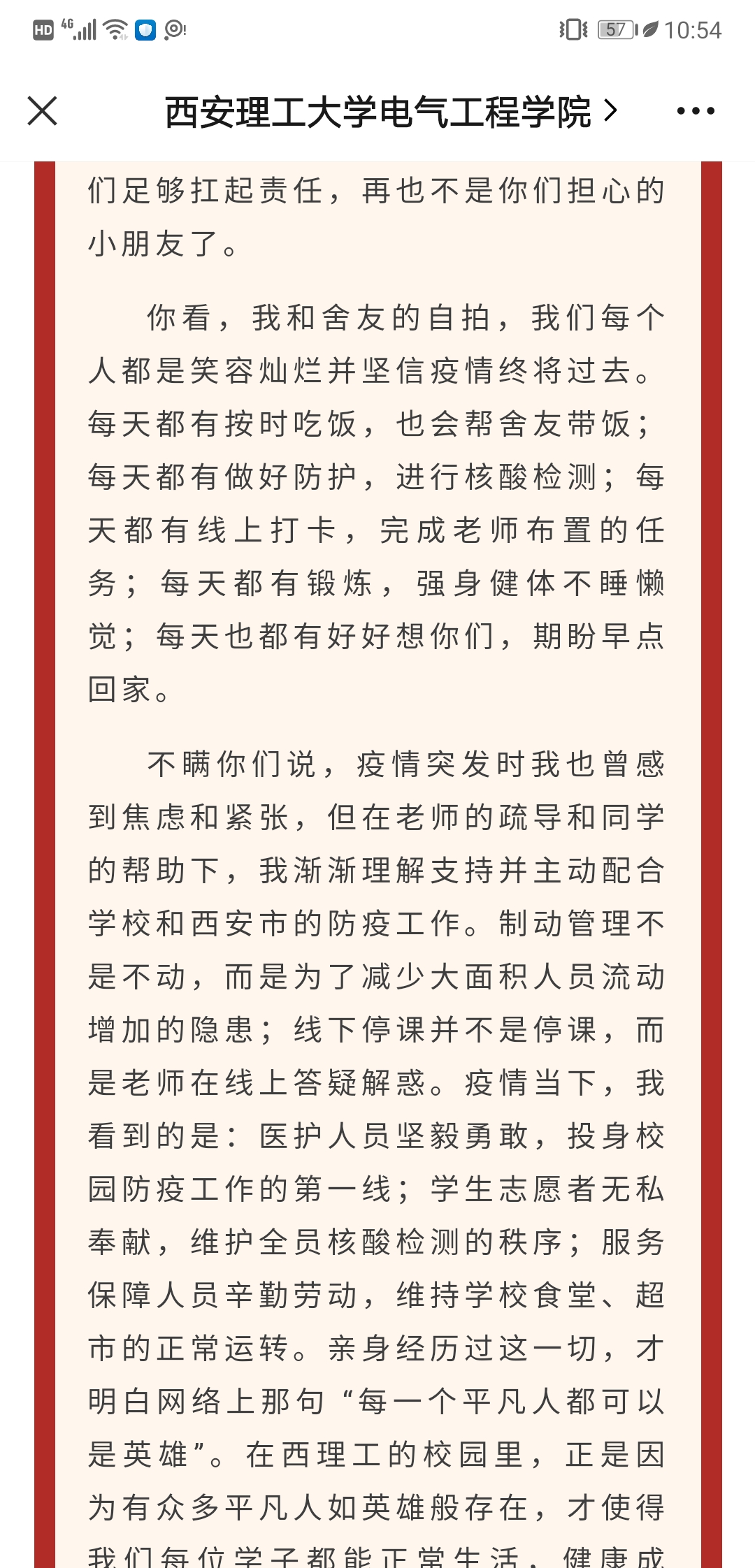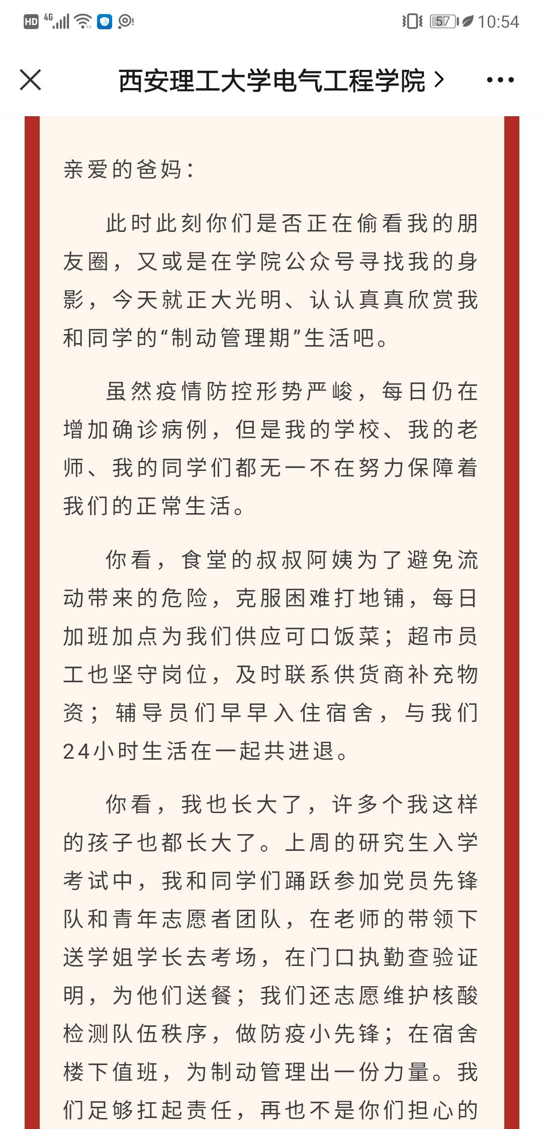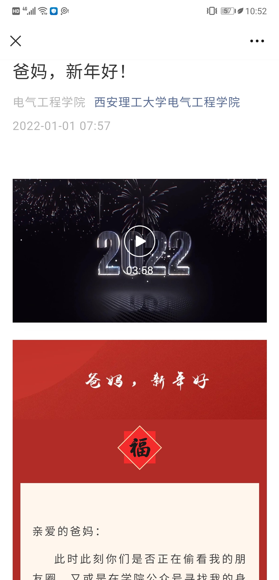 在严峻的疫情防控形势下,研究生的心里疏导至关重要。2022年的第一天,因疫情的“封锁”,万千西安学子只能“制动”在宿舍,最关心、牵挂、思念他们的无不外乎是他们自己的父母。为此,学院在新年第一天,特别发起了专题活动“爸妈,新年好”,制作了推文并录制了视频,向无法在这个新年陪伴他们的父母展现在校健康、稳定的生活,也传达学子们对父母、家人的祝福。