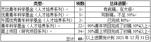 通过系所科研主任上报、科研秘书与院长“纵横”摸排,通过各种方式问询了每一位教师后,确定了学院拟申报2022年国家自然科学基金的负责人、项目类型、初步题目、进展情况等。83位专任教师中有56位拟申报,占67.5%,外加兼职教师、即将入职博士一共拟申报60项基金项目。这些拟申报的项目中,类别、项数、进展统计如下。