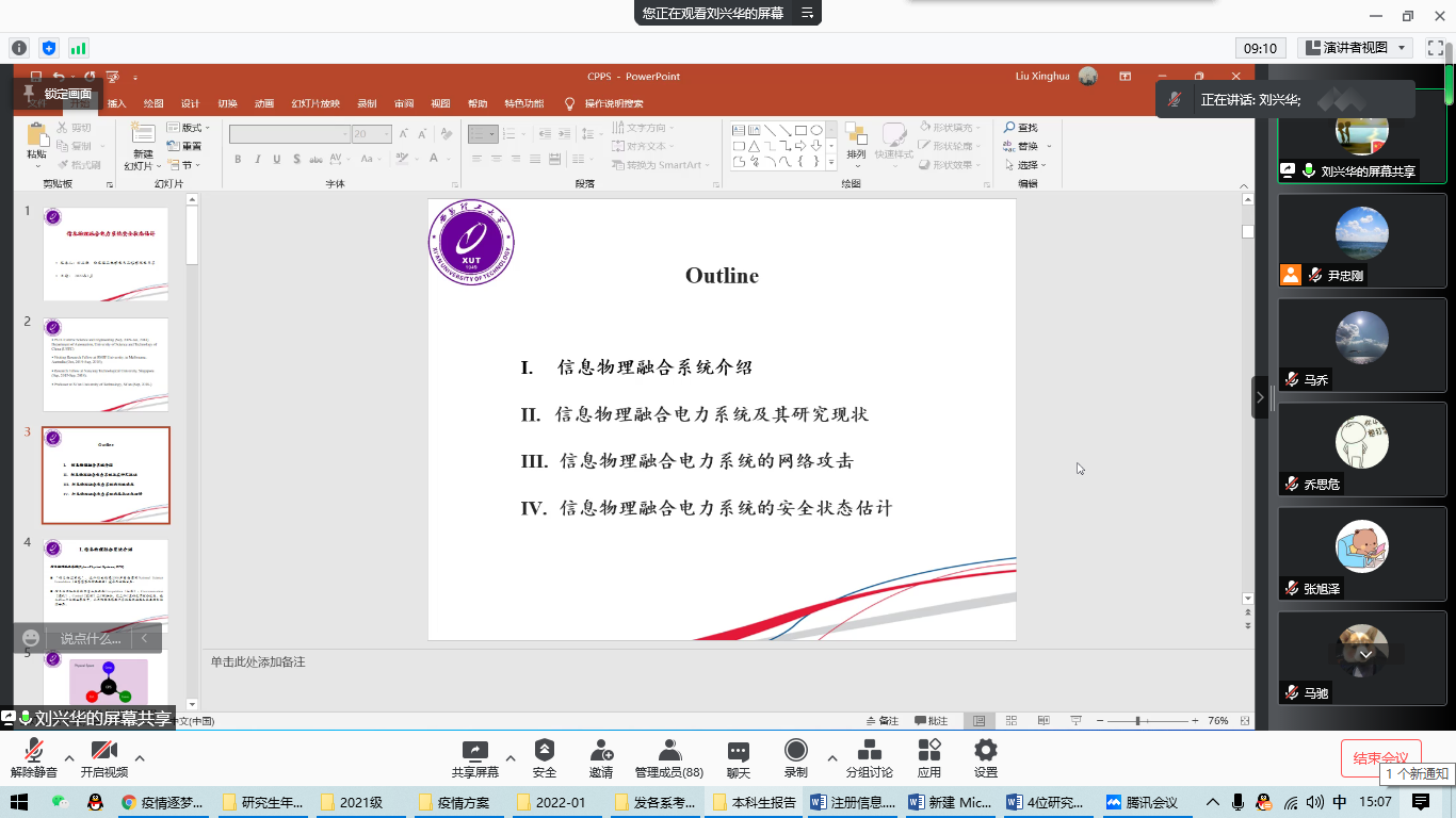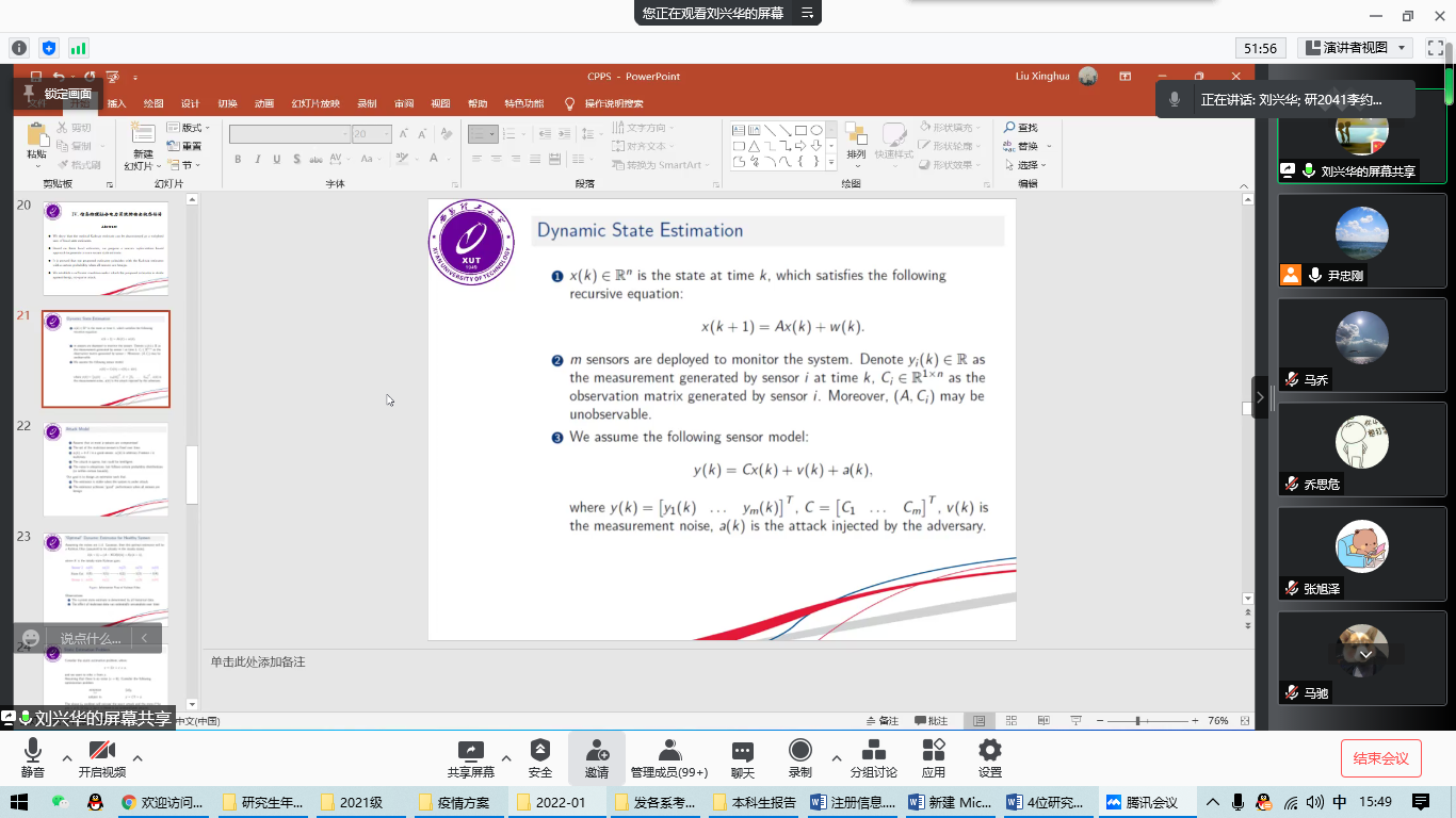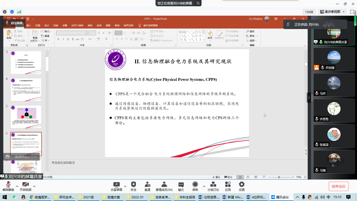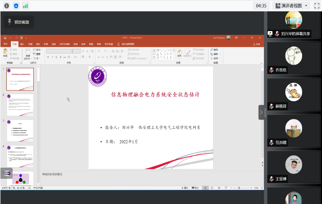 在CPPS的安全状态估计方面,刘老师还对个人研究的最新成果进行了介绍和分享,在交流阶段,刘老师与同学们热烈互动,在电力系统状态估计方面进行了充分探讨,并给出了一些建议。