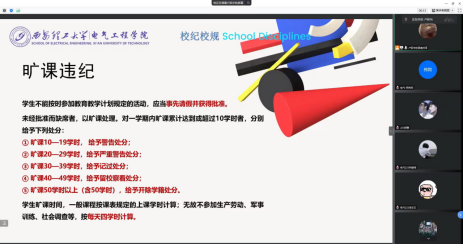 学院通过线上会议的形式教育组织新生认真学习《普通高等学校学生行为准则》《西安理工大学学生违纪处分规程》等内容,引导学生遵规守纪。同时开展疫情防控相关方面的宣传和指导,以增强学生疫情防控意识,培养学生树立责任意识。