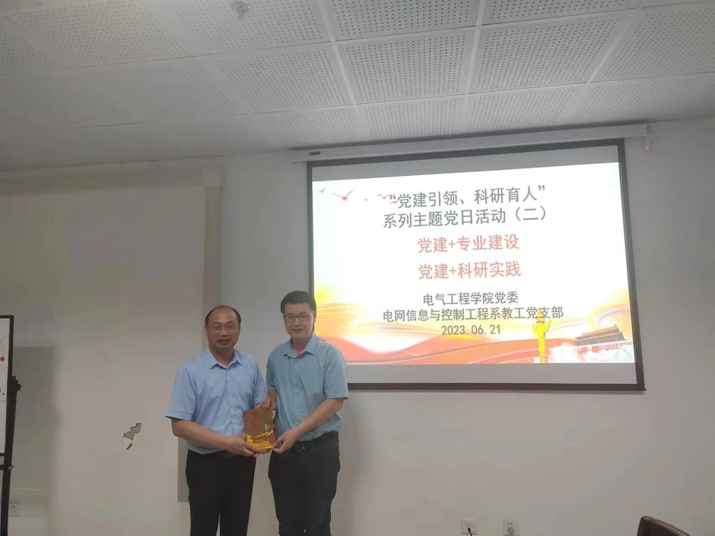 主题党日活动邀请了同向前教授和段建东教授分别做了“党建引领、科研育人”方面的报告。同老师从科研要有内生动力和外在推力、要努力上进但也不强求、青年教师要注重基础性和理论性研究、集中方向多申请纵向课题、避免项目过多分散、集中精力将项目做深做好并推广应用、科研团队要目标明确、团队联合攻关取得更大成效等八个方面给青年教师科研方面进行了指导和建议。段老师从智能电网信息工程一流专业建设、经费使用、建设举措和成效方面作了详细报告,并鼓励青年教师发表教改论文,积极参与一流专业建设;在科研实践方面,段老师结合自身团队的经验,从科研方向的选择、科研过程、成果凝练、科研报奖、学生管理等方面进行了经验分享,鼓励青年教师聚焦科研方向,借助团队力量进行有组织科研。