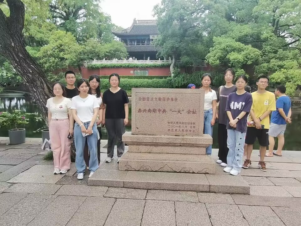 实习队首先近距离瞻仰了南湖红船”,在中共一大会址纪念碑前合影留念。同学们深刻认识到红船精神内涵丰富、思想深邃,是中国革命精神之源和党的先进性之源,是指引我们不断前进的强大思想武器,是我们共产党人薪火相传的精神源泉、红色基因。秀水泱泱,红船依旧;时代变迁,精神永恒。红船精神具有历久弥新的时代价值。在新的征程上,同学们立志要结合时代特点大力弘扬红船精神,敢于创新,勇于奉献,增强斗争精神、提高斗争本领,百折不挠、不懈奋斗,助力中华民族伟大复兴的巨轮行稳致远,胜利驶向光辉的彼岸。