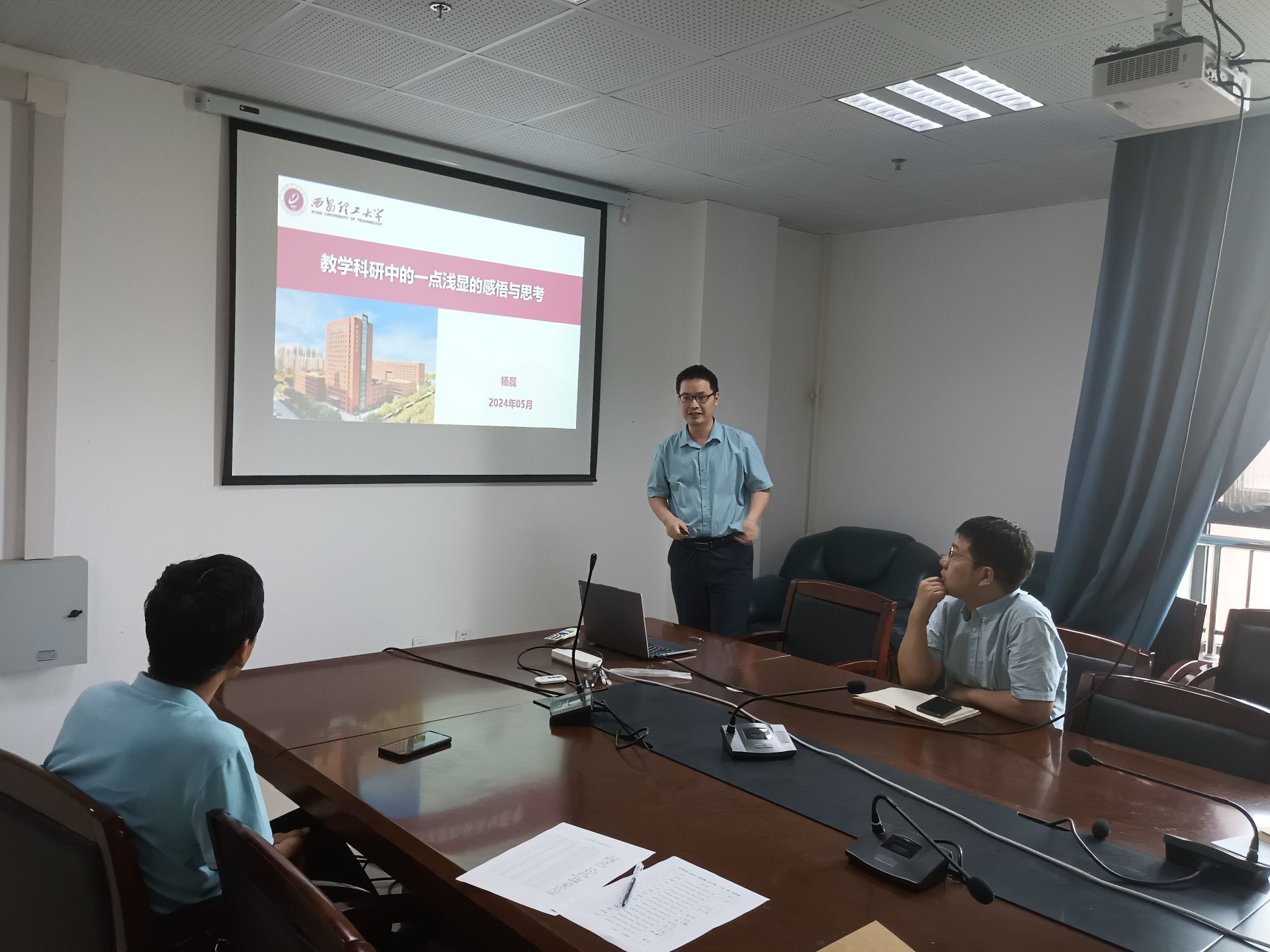本次主题党日活动邀请校教书育人先进个人杨磊副教授做了以“教学科研中的一点浅显的感悟与思考”为主题的报告。杨老师从保持认知更新与反省、教学与科研的一点思考、从学生中来到学生中去三个方面进行了介绍。首先分享了加州大学欧文分校和康涅狄格大学两段访学经历,然后从自身科研经历出发并结合晚清名臣曾国藩的“大处着眼、小处着手”引出科学研究要想的“大”,向着“实”,要有“参禅悟道”似的定力以及“山顶之上还有广阔星空”的抱负追求。接着系统讲述了培养学生要坚持教学特色与应用实践,并及时充电和丰富自己,做到因材施教、因人施教,乐于作学生们的“踏脚石”和“人梯”。最后,杨老师结合着乔布斯的传记并引用其“只有那些疯狂到以为自己能够改变世界的人,才能真正的改变世界”的名言,讲述以“踏石留痕”的毅力坚信西安理工大学的学生中肯定会出现世界级的科学家、政治家和企业家,并要为之奋斗终身!