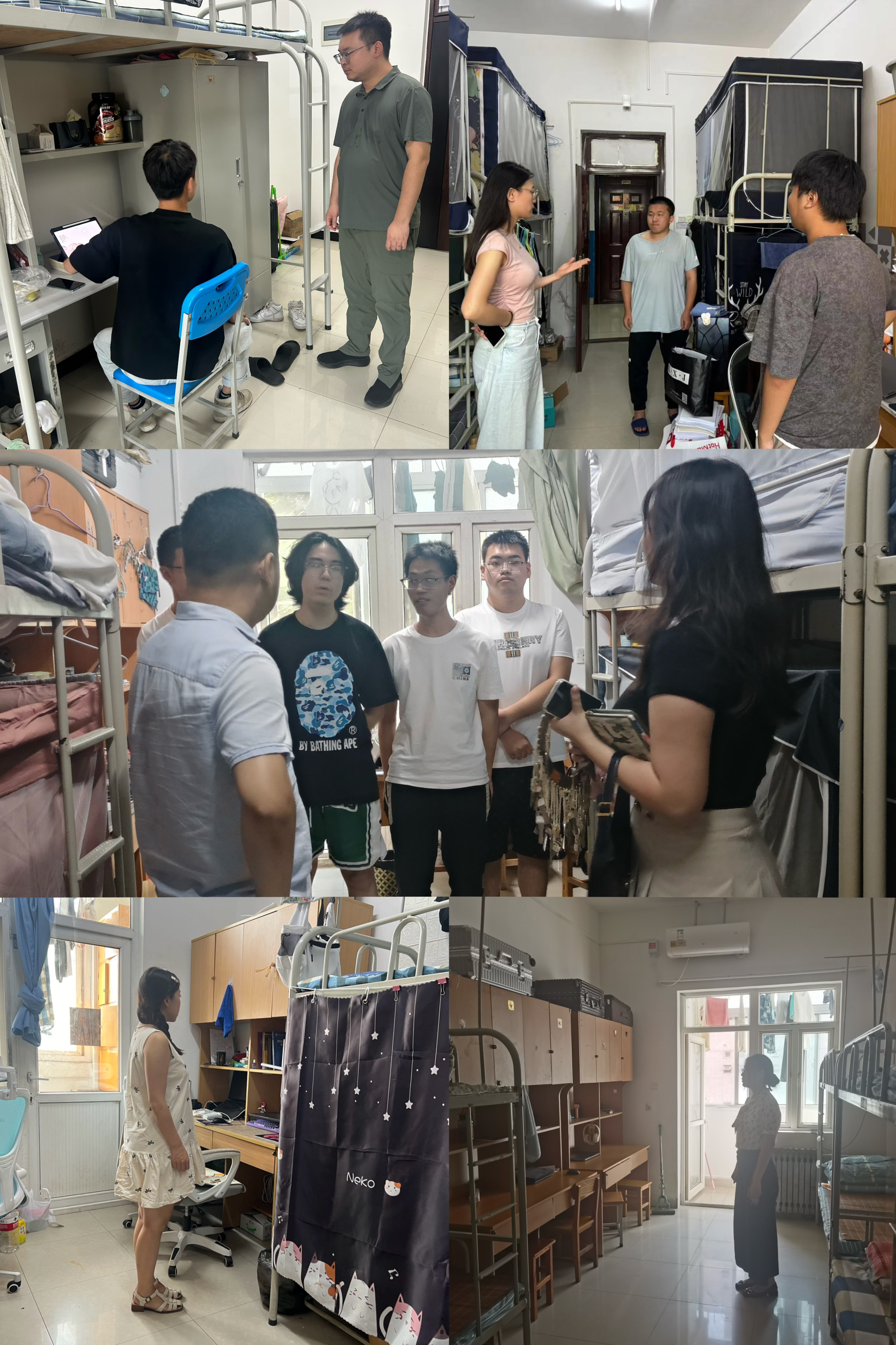 在走访各年级宿舍过程中,各年级辅导员询问了学生的假期去向,并提醒外出的学生注意交通安全,提醒留校的学生合理安排假期时间,注意宿舍用电安全、食品安全、防火防盗防诈骗,提防传销、求职陷阱等。此外各位老师还对毕业班学生的就业、考研情况以及其他各年级学生的学习生活情况进行了详细询问,并叮嘱学生养成良好的个人卫生习惯,共同营造良好的宿舍环境。