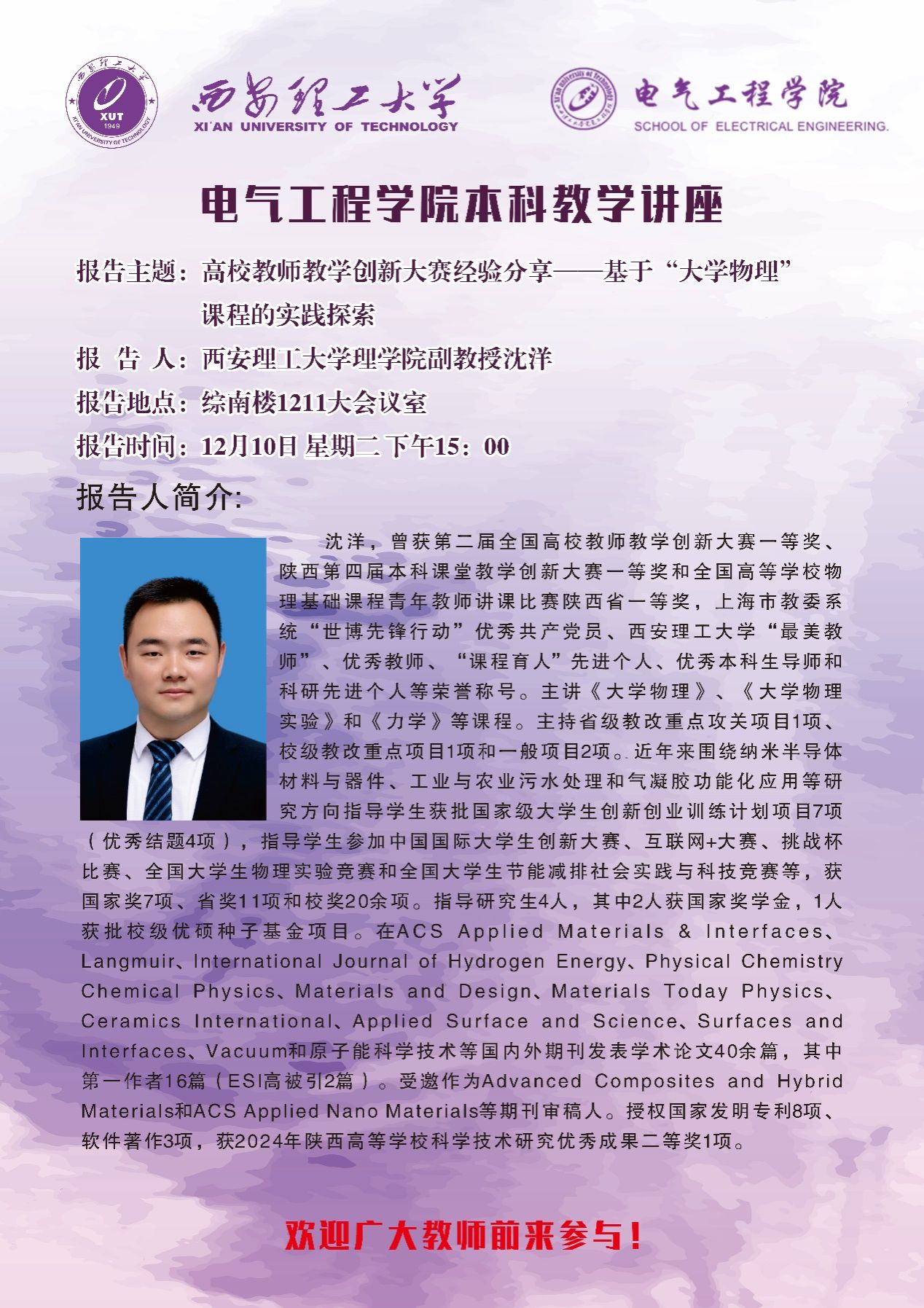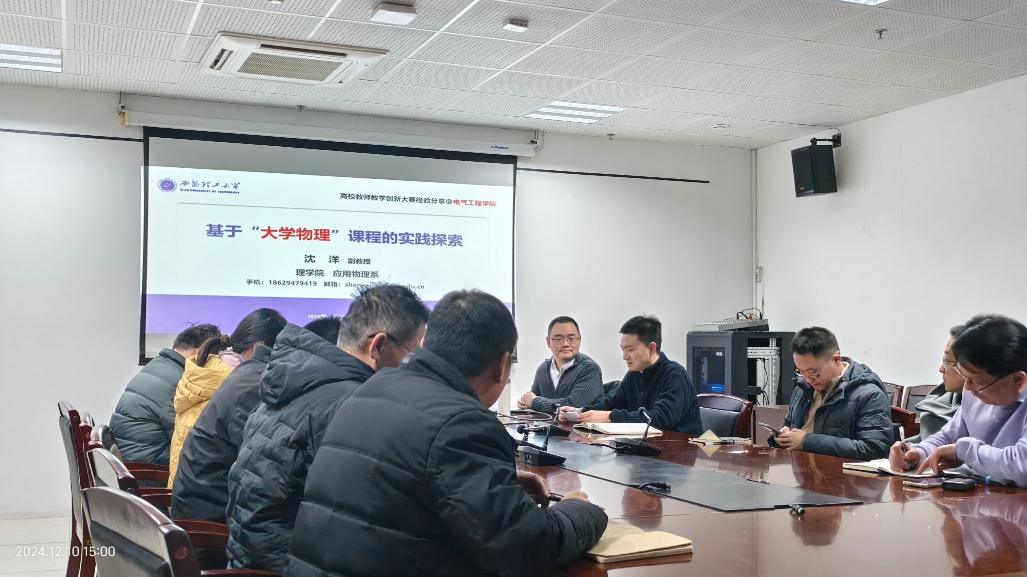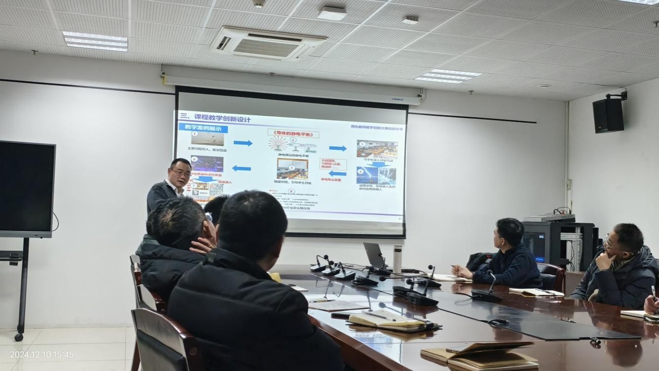 12月10日下午,电气工程学院在综南楼 1211 会议室举办了一场以 “高校教师教学创新大赛经验分享—基于大学物理课程的实践探索” 为主题的报告讲座。此次讲座由理学院副教授沈洋主讲,学院副院长杨国清教授出席,各系所教学主任及青年教师等二十余人参与。