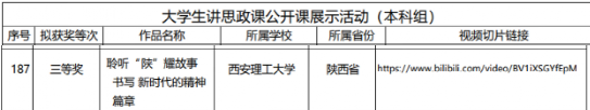 日前,由教育部高校思想政治理论课教学指导委员会主办的第八届全国高校大学生讲思政课公开课展示活动评审结果揭晓。我院报送的作品《聆听“陕”耀故事 书写新时代的精神篇章》在全国1339所高校提交的5007部作品中脱颖而出,获得本科生组三等奖。