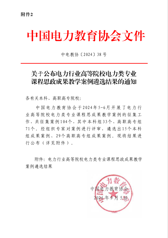 电力行业高等院校电力类专业课程思政成果教学案例征集与推广活动由中国电力教育协会组织,旨在持续推进课程思政教学改革创新,切实提升电力行业技术技能人才培养质量,培养造就大批德才兼备的高素质人才。此次共有104个课程思政教学案例参与遴选,经过专家评审,15个本科组成果案例被遴选为优秀教学案例。