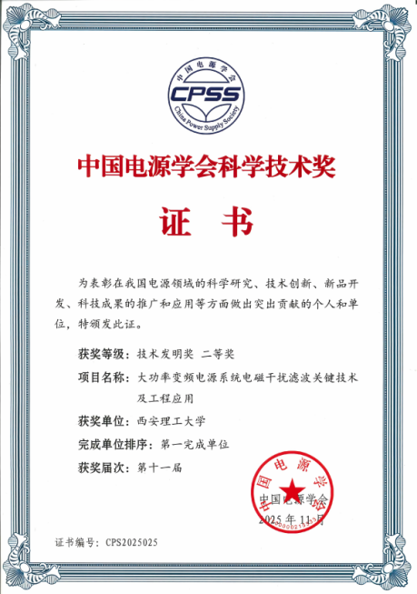 2025年11月8日,中国电源学会在广东省深圳市举行了第十一届中国电源学会科学技术奖颁奖仪式,对2025年中国电源学会科学技术奖获奖项目和青年科技奖获奖人(其中项目类一等奖4项,二等奖13项,技术创新奖4项;人物类科技成就奖2人,青年科技突破奖1人,青年科技创新奖3人)进行了公布和表彰。