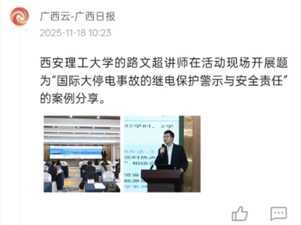 11月18日,中国电力教育协会2025年度电力行业高等院校课程思政建设成果教学案例交流会在广西水利水电职业技术学院开幕,会议公布了电力行业高等院校电力类专业课程思政成果教学案例遴选结果。我院段建东、王建华、呼梦颖、路文超老师负责的“国际大停电事故的继电保护警示与安全责任——《电力系统自动化新技术》课程思政教学案例”成功入选。