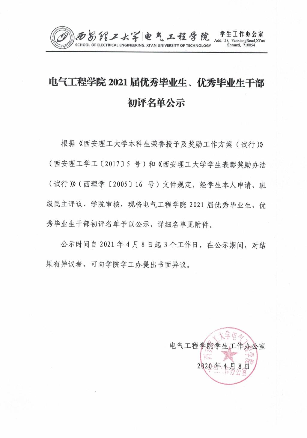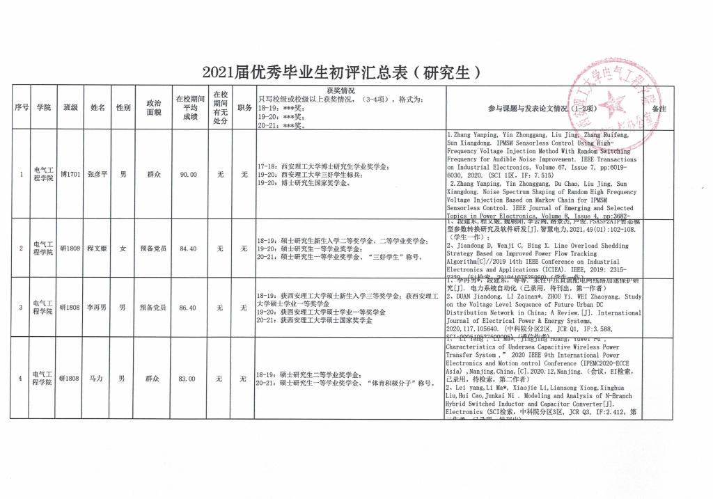 电气工程学院2021届优秀毕业生、优秀毕业生干部初评名单公示