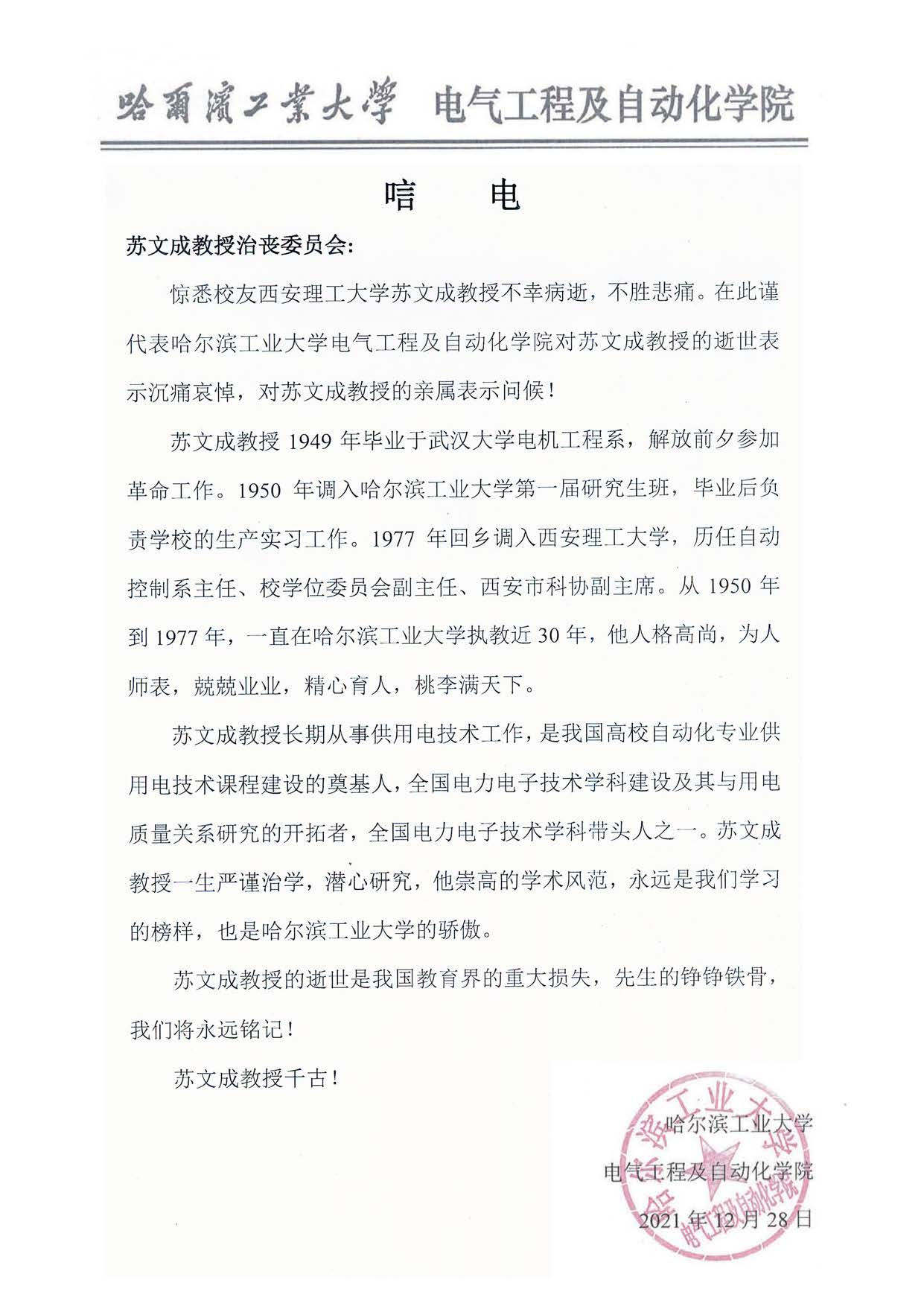 哈尔滨工业大学电气工程及自动化学院 唁电