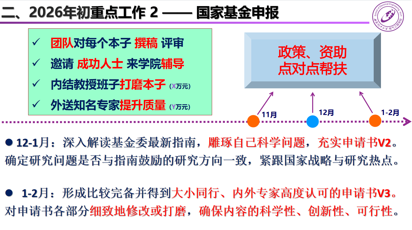贾嵘院长重点强调了国家自然科学基金等国家级项目对全院教师,尤其是青年教师成长的重要性。贾院长指出,临近学期末和寒假,希望拟申请2026年国家自然科学基金的教师要排除一切干扰,集中精力,充分利用未来两个月时间,认真修改申请书。并且,要求学院教师持之以恒,敢闯敢拼,加强“内功修炼”的同时,积极参加各类学术交流,积极寻求知名专家打磨申请书。