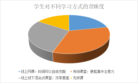 针对同学们反馈,更怀念传统课堂的同学们的主要原因在于与老师互动交流不方便以及学习资源少,只有少部分同学受网络拥塞和流量不够等客观原因。这一结果对后期调整教学手段也指明了一条路径:尽可能的多种方式与同学交流以及使用网络提供给学生多样的辅助学习资源。